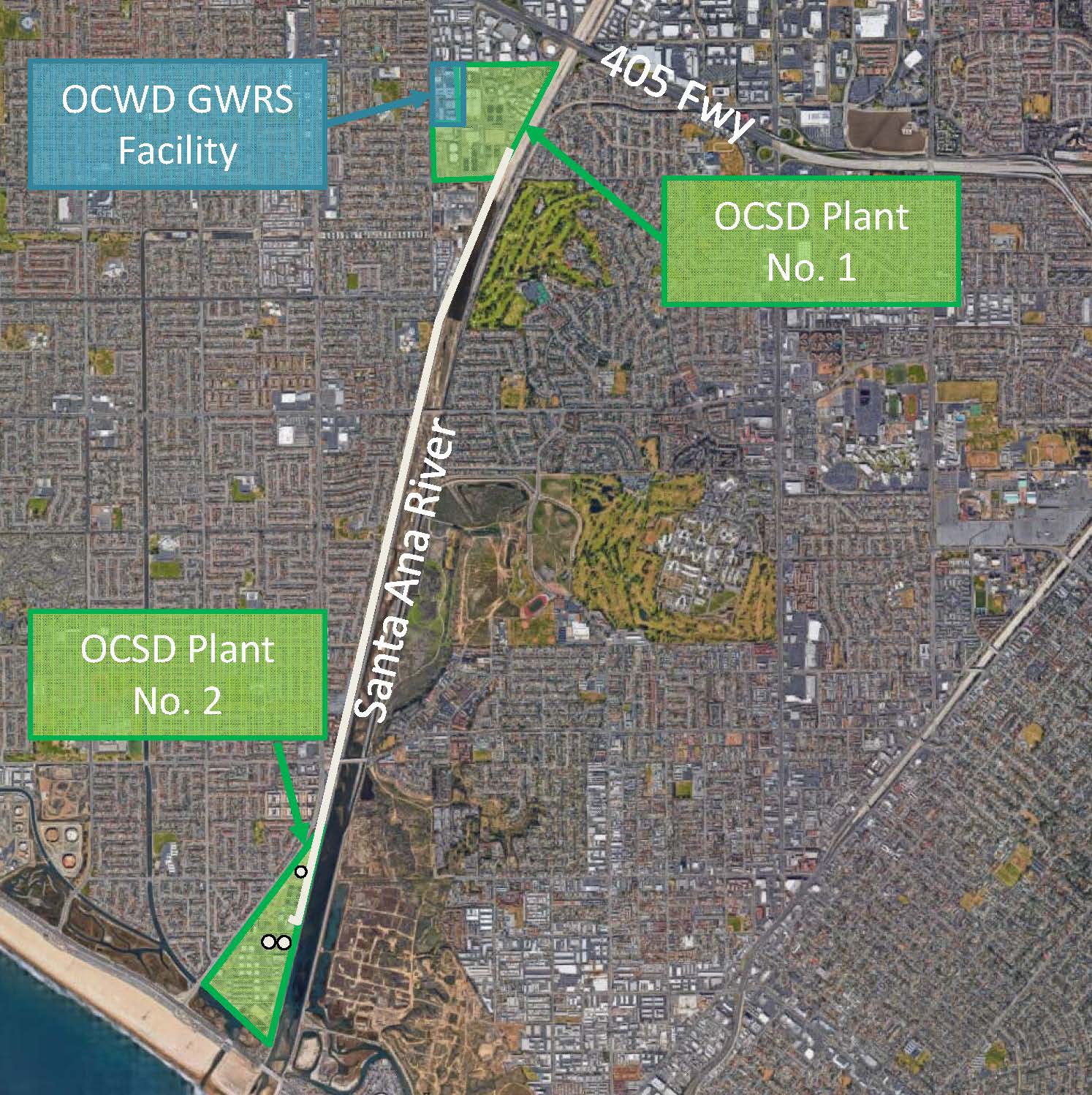 Aerial Image of OCWD and OCSD Plant No. 1 in Fountain Valley, CA. OCSD currently delivers all Plant No. 1 secondary effluent, 115-125 mgd, to the OCWD GWRS facility which produces 100 mgd of purified water.