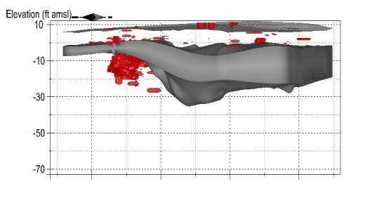 TarGOST. Using TarGOST data and EVS modeling, an unprecedented level of characterization of the mobile NAPL phase (shown in red) was possible. This detail allowed design of the placement of 2,300 ignition points. Much of the NAPL mass is located below where the lagoons were located. The grey zone between ca. 5 feet to -33 ft above mean seal level is a low permeable clay peat layer know locally as the "Meadow Mat".